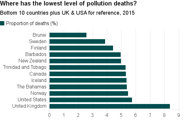 Brunei and Sweden had the lowest numbers of pollution-related deaths.